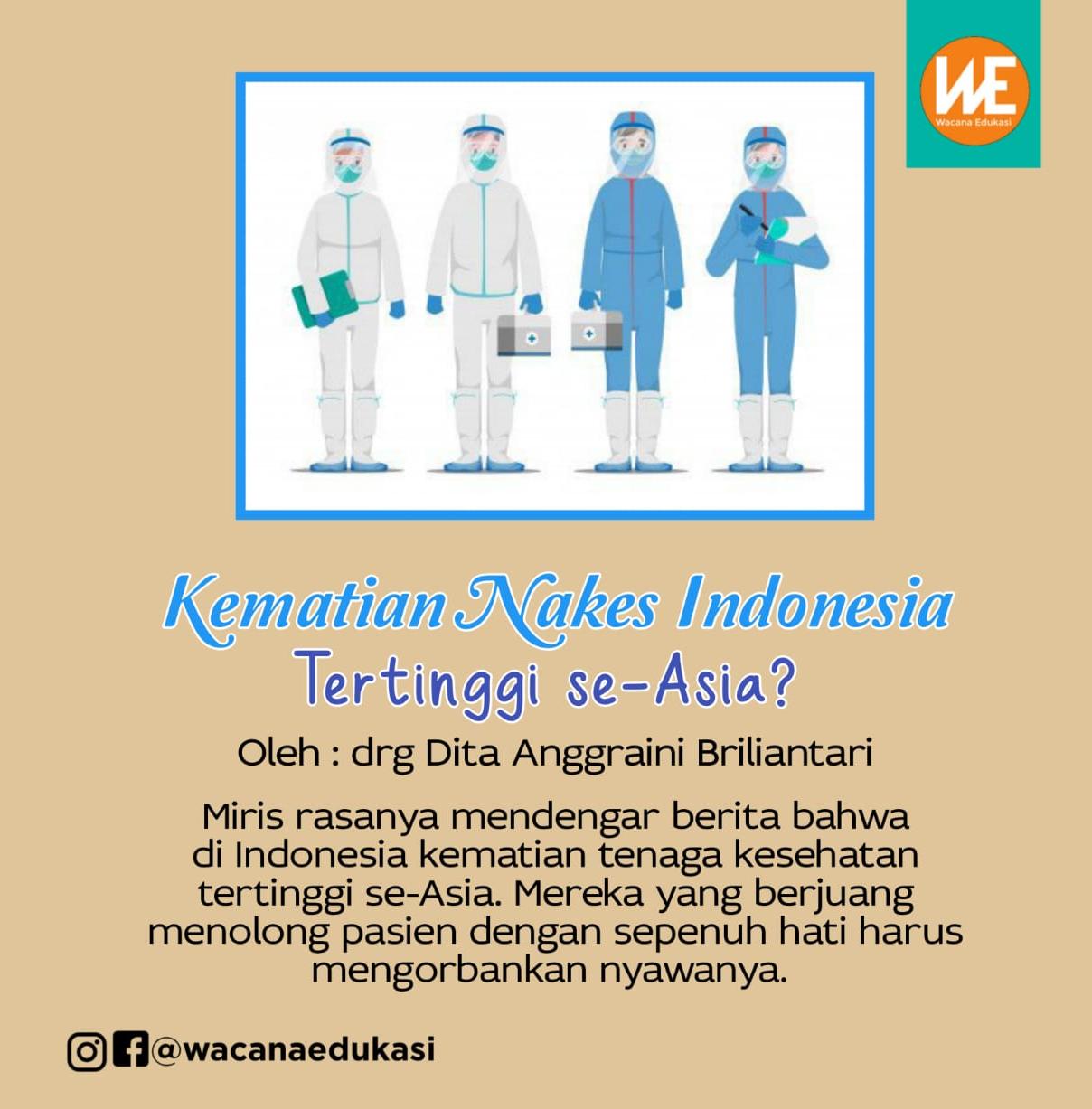 Wacana-edukasi.com — Miris rasanya mendengar berita bahwa di Indonesia kematian tenaga kesehatan tertinggi se-Asia. Mereka yang berjuang menolong pasien dengan sepenuh hati harus mengorbankan nyawanya. Entah apa yang salah, apakah fasilitas yang kurang memadai bagi pejuang garda terdepan ini atau memang jumlah tenaga kesehatan sendiri yang kurang. Sehingga, banyak di antara mereka yang kelelahan. Akibatnya, menurun daya tahan tubuh mereka.