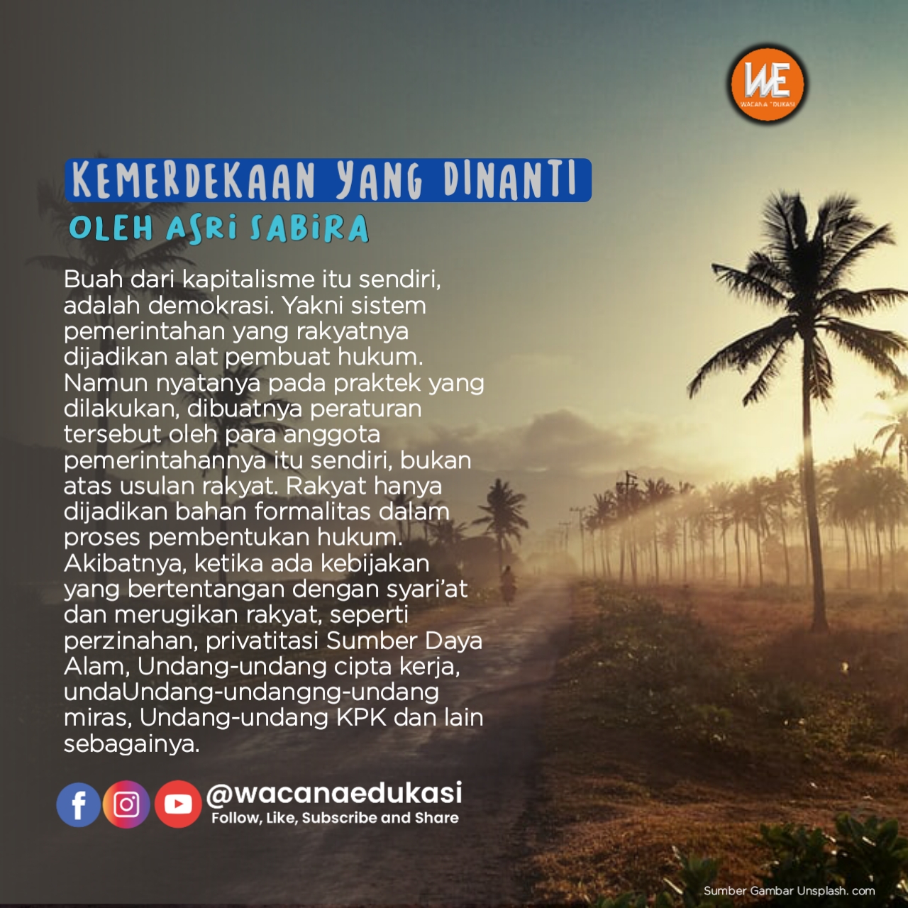 Maka dari itu, mari raih kemerdekaan haqiqi dengan mewujudkan Islam secara kafah dalam naungan Khilafah Islamiyah. Kemerdekaan ini pasti akan terjadi, karena allah telah menjanjikan pada umat manusia, bahwa Islam akan menaungi dunia dari timur hingga barat.