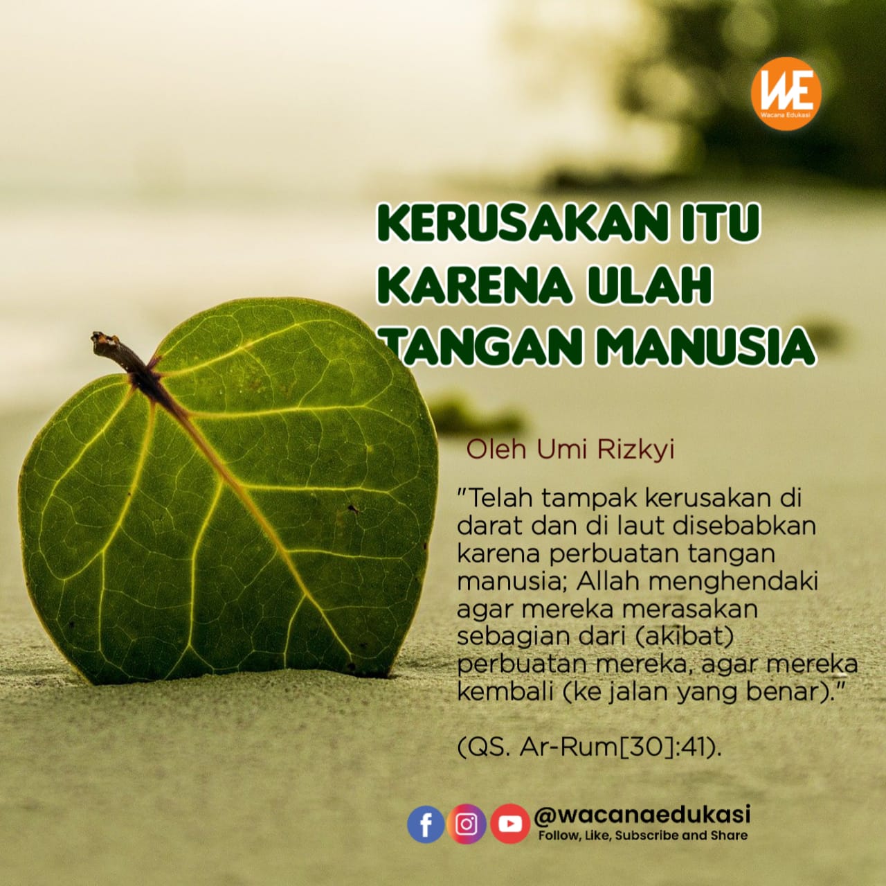 “Telah tampak kerusakan di darat dan di laut disebabkan karena perbuatan tangan manusia; Allah menghendaki agar mereka merasakan sebagian dari (akibat) perbuatan mereka, agar mereka kembali (ke jalan yang benar).”