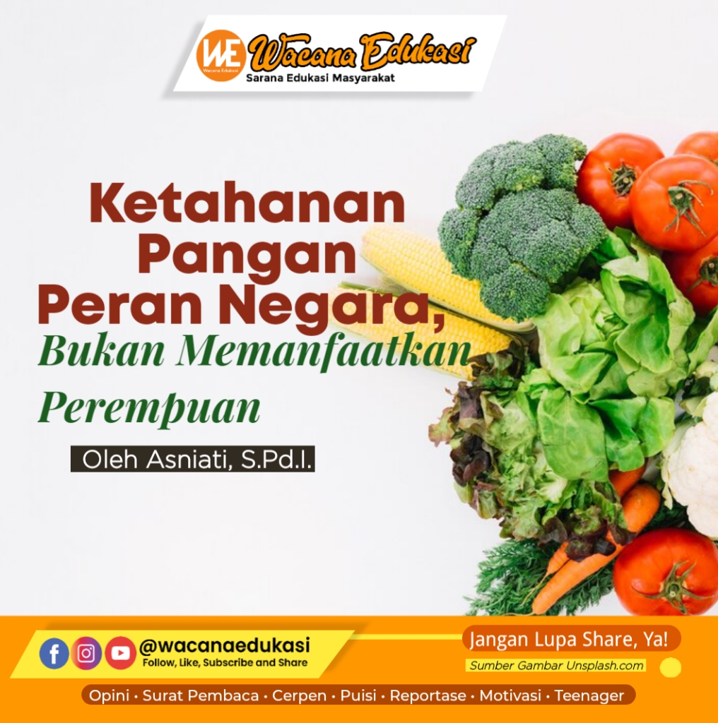 Ketahanan pangan tanggung jawab negara bukan perempuan. Bagi bangsa mana pun, pangan adalah salah satu kebutuhan dasar yang sangat penting. Terpenuhinya pangan akan berpengaruh besar pada kemajuan bangsa. Pangan yang lengkap dapat membuat kebutuhan nutrisi tubuh tercukupi. Dengan tubuh yang sehat, seseorang akan memiliki kekuatan dan kemampuan untuk berpikir dan beraktivitas. Masyarakat yang nutrisinya terpenuhi juga mudah dididik sehingga akan terbentuk SDM yang berkualitas.