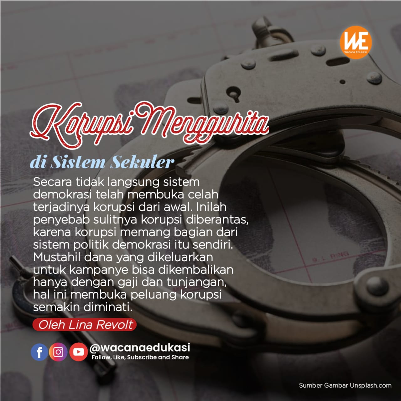 Pertama, diterapkannya sistem sekuler yang memisahkan agama dari kehidupan menjadikan nilai- nilai keimanan dan ketakwaan hilang dari negara dan politik. Sehingga menjadikan para penguasa maupun aparatur negara yang diberi amanah mengurusi uang rakyat tidak merasa sedang diawasi oleh Allah Swt.