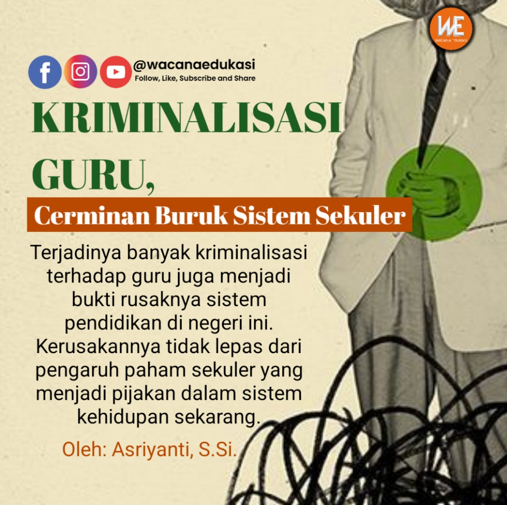 Terjadinya banyak kriminalisasi terhadap guru juga menjadi bukti rusaknya sistem pendidikan di negeri ini. Kerusakannya tidak lepas dari pengaruh paham sekuler yang menjadi pijakan dalam sistem kehidupan sekarang. Paham sekuler yang berarti memisahkan nilai-nilai agama dari pengaturan kehidupan, termasuk dalam dunia pendidikan, menjadikan negara dalam hal ini pemerintah melahirkan kebijakan yang tidak lagi berlandaskan agama.