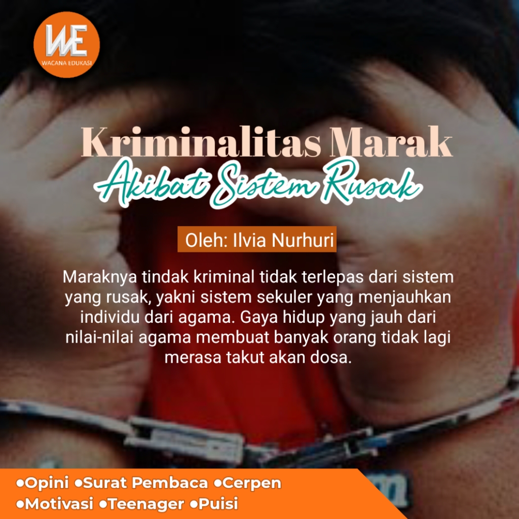 Maraknya tindak kriminal tidak terlepas dari sistem yang rusak, yakni sistem sekuler yang menjauhkan individu dari agama. Gaya hidup yang jauh dari nilai-nilai agama membuat banyak orang tidak lagi merasa takut akan dosa. Dalam sistem sekuler, aturan agama tidak lagi menjadi penghalang bagi seseorang untuk melakukan kejahatan, sehingga perilaku masyarakat semakin terdegradasi. Fungsi kontrol diri dalam individu pun menjadi lemah akibat rendahnya keimanan, seolah-olah surga dan neraka hanyalah konsep yang tidak berhubungan dengan kehidupan sehari-hari.