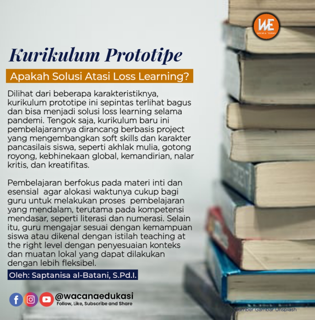 Dilihat dari beberapa karakteristiknya, kurikulum prototipe ini sepintas terlihat bagus dan bisa menjadi solusi loss learning selama pandemi. Tengok saja, kurikulum baru ini pembelajarannya dirancang berbasis project yang mengembangkan soft skills dan karakter pancasilais siswa, seperti akhlak mulia, gotong royong, kebhinekaan global, kemandirian, nalar kritis, dan kreatifitas. Pembelajaran berfokus pada materi inti dan esensial agar alokasi waktunya cukup bagi guru untuk melakukan proses pembelajaran yang mendalam, terutama pada kompetensi mendasar, seperti literasi dan numerasi. Selain itu, guru mengajar sesuai dengan kemampuan siswa atau dikenal dengan istilah teaching at the right level dengan penyesuaian konteks dan muatan lokal yang dapat dilakukan dengan lebih fleksibel.