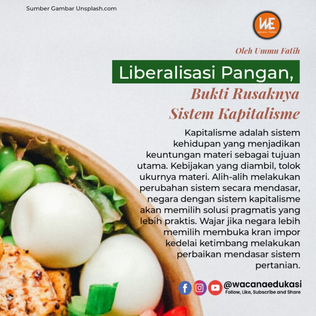Kapitalisme adalah sistem kehidupan yang menjadikan keuntungan materi sebagai tujuan utama. Kebijakan yang diambil, tolok ukurnya materi. Alih-alih melakukan perubahan sistem secara mendasar, negara dengan sistem kapitalisme akan memilih solusi pragmatis yang lebih praktis. Wajar jika negara lebih memilih membuka kran impor kedelai ketimbang melakukan perbaikan mendasar sistem pertanian.