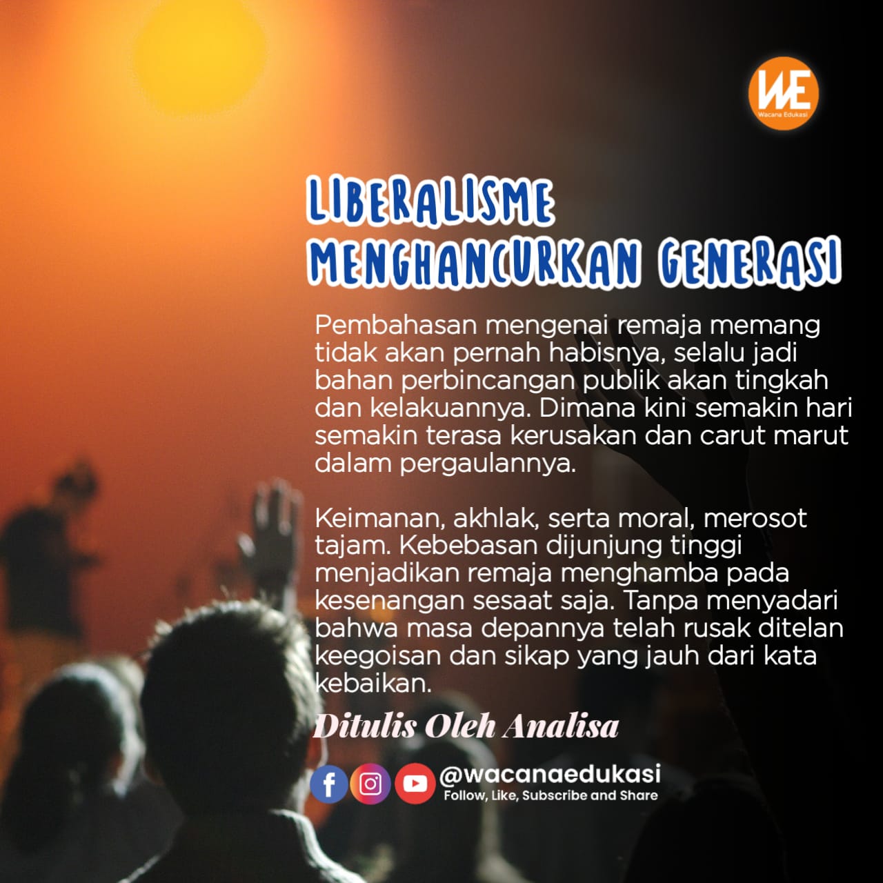 Keimanan, akhlak, serta moral, merosot tajam. Kebebasan dijunjung tinggi menjadikan remaja menghamba pada kesenangan sesaat saja. Tanpa menyadari bahwa masa depannya telah rusak ditelan keegoisan dan sikap yang jauh dari kata kebaikan.