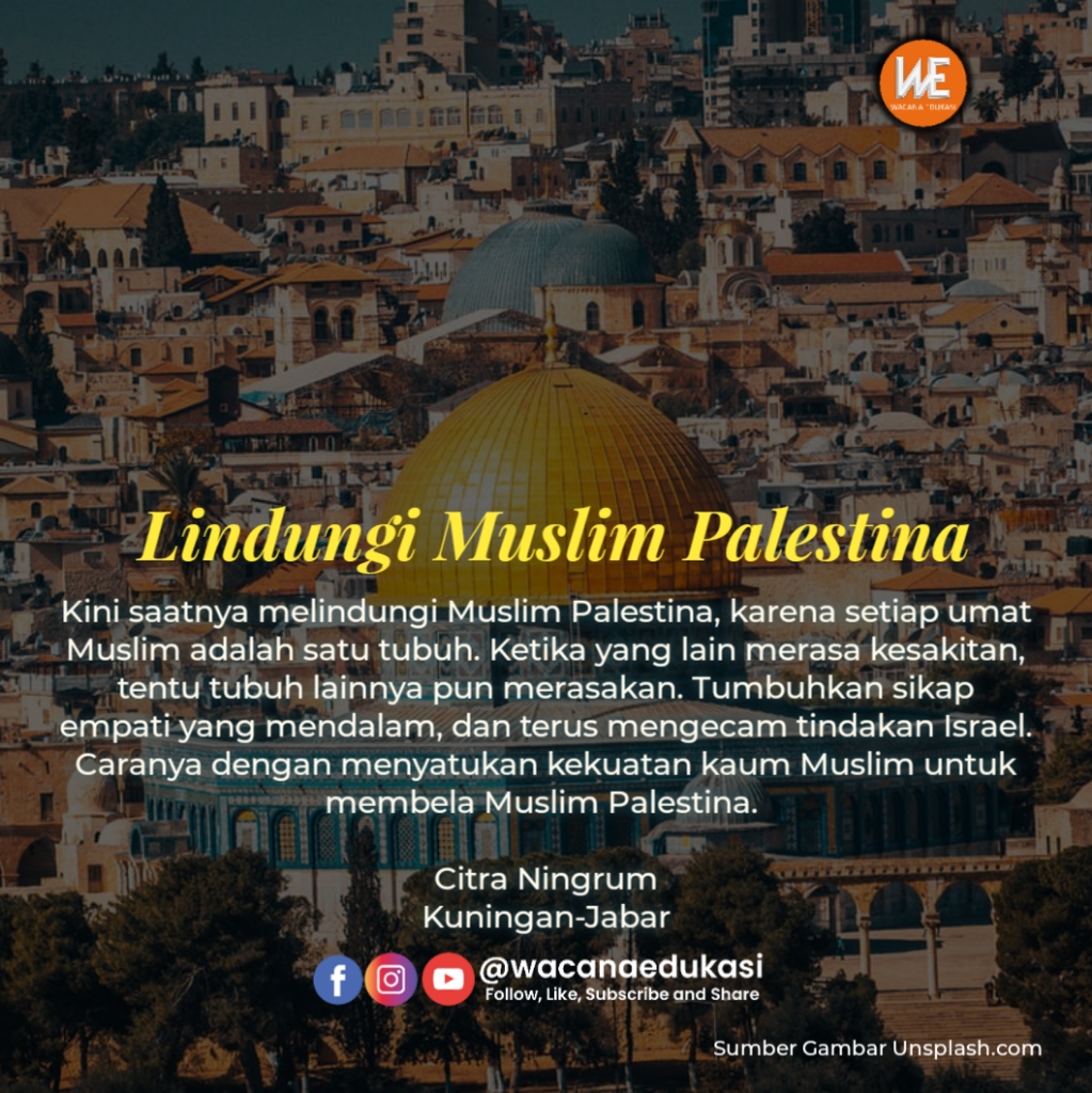 Kini saatnya melindungi Muslim Palestina, karena setiap umat Muslim adalah satu tubuh. Ketika yang lain merasa kesakitan, tentu tubuh lainnya pun merasakan. Tumbuhkan sikap empati yang mendalam, dan terus mengecam tindakan Israel. Caranya dengan menyatukan kekuatan kaum Muslim untuk membela Muslim Palestina.