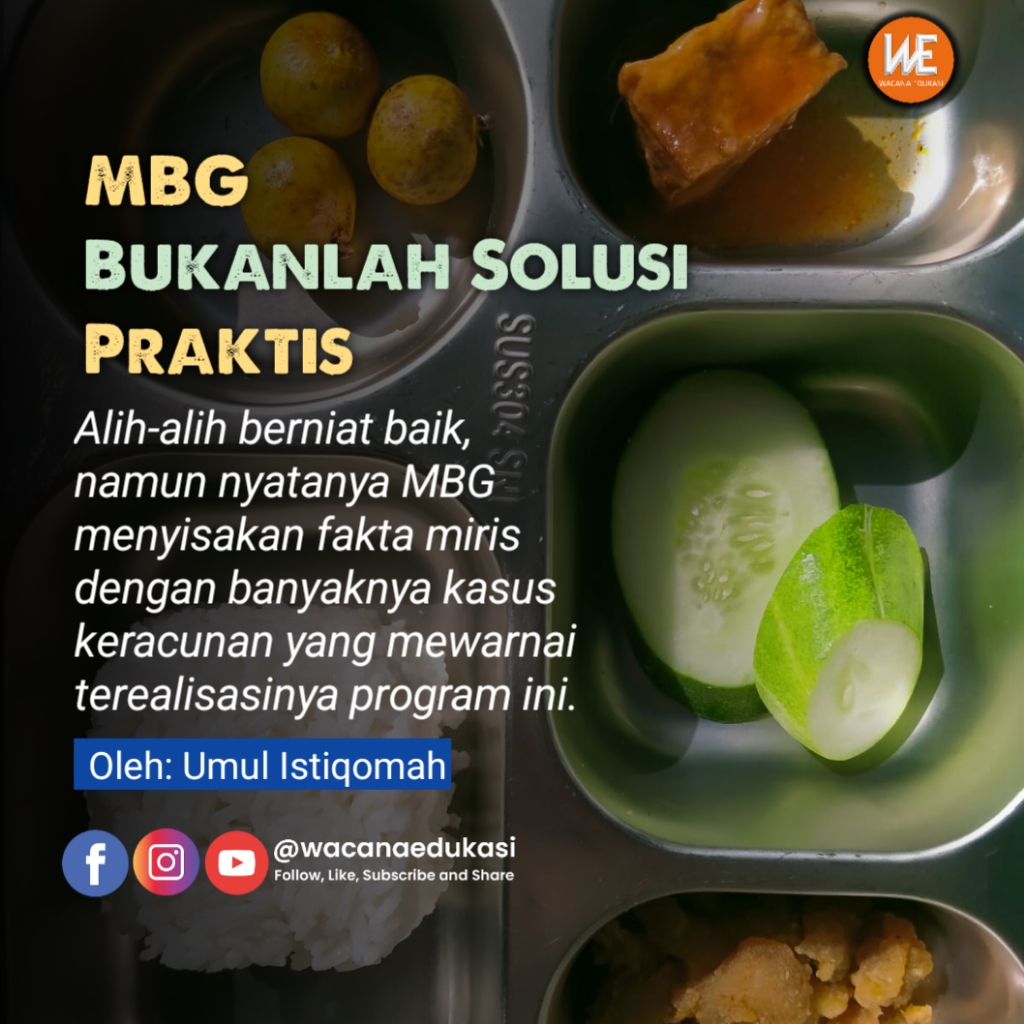 Alih-alih berniat baik, namun nyatanya MBG menyisakan fakta miris dengan banyaknya kasus keracunan yang mewarnai terealisasinya program ini. MBG (Makan Bergizi Gratis) adalah sebuah program unggulan yang digaungkan oleh presiden terpilih saat kampanye, yang sudah mulai terealisasi sejak awal tahun 2025, artinya kurang lebih sudah 9 bulan berjalan dan mencakup seluruh provinsi di tanah air.