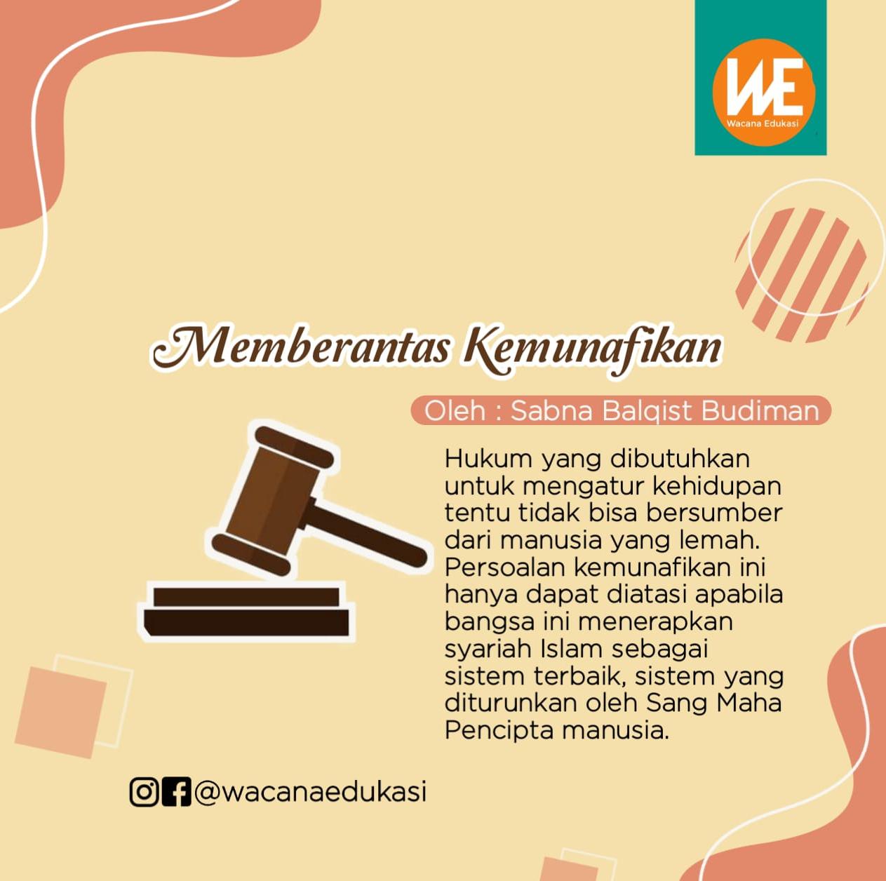 Hukum yang dibutuhkan untuk mengatur kehidupan tentu tidak bisa bersumber dari manusia yang lemah. Persoalan kemunafikan ini hanya dapat diatasi apabila bangsa ini menerapkan syariah Islam sebagai sistem terbaik, sistem yang diturunkan oleh Sang Maha Pencipta Manusia. Sebagaimana yang difirmankan Allah Swt. dalam Al-Maidah ayat 50 yang artinya: