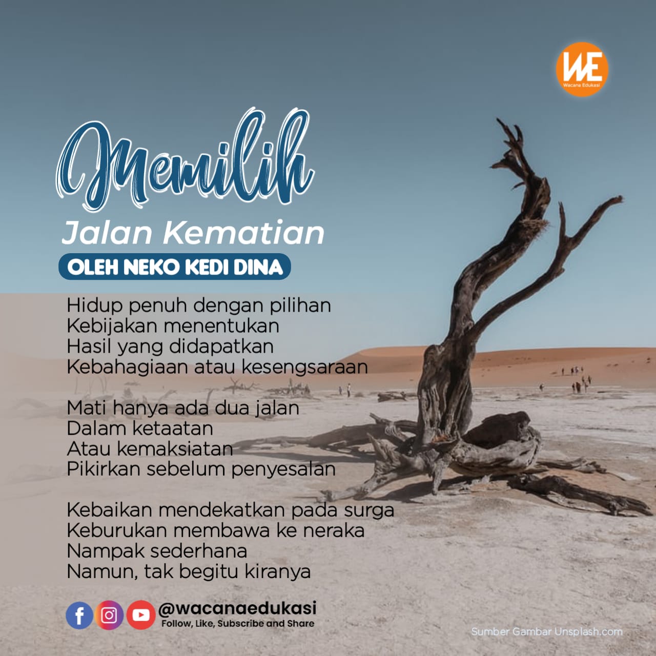 Wacana Edukasi adalah sarana edukasi masyarakat. Silakan kirimkan tulisan anda ke media kami. Wacana Edukasi akan melakukan seleksi dan menayangkan berbagai naskah dari Anda. Tulisan yang dikirim bisa berupa Opini, SP, Puisi, Cerpen, Sejarah Islam, Tsaqofah Islam, Fiqih, Story Telling, Olah raga, Kesehatan, Makanan, ataupun tulisan lainnya. Tulisan tidak boleh berisi hoaks, mengandung SARA, ujaran kebencian, dan bertentangan dengan syariat Islam. Tulisan yang dikirim sepenuhnya menjadi tanggungjawab penulis.