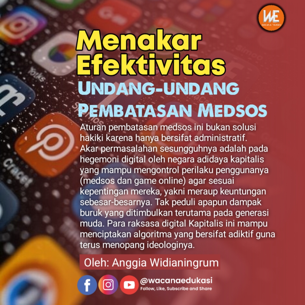 Aturan pembatasan medsos ini bukan solusi hakiki karena hanya bersifat administratif. Akar permasalahan sesungguhnya adalah pada hegemoni digital oleh negara adidaya kapitalis yang mampu mengontrol perilaku penggunanya (medsos dan game online) agar sesuai kepentingan mereka, yakni meraup keuntungan sebesar-besarnya. Tak peduli apapun dampak buruk yang ditimbulkan terutama pada generasi muda. Para raksasa digital Kapitalis ini mampu menciptakan algoritma yang bersifat adiktif guna terus menopang ideologinya.