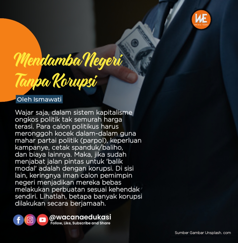 Wajar saja, dalam sistem kapitalisme ongkos politik tak semurah harga terasi. Para calon politikus harus meronggoh kocek dalam-dalam guna mahar partai politik (parpol), keperluan kampanye, cetak spanduk/baliho, dan biaya lainnya. Maka, jika sudah menjabat jalan pintas untuk ‘balik modal’ adalah dengan korupsi. Di sisi lain, keringnya iman calon pemimpin negeri menjadikan mereka bebas melakukan perbuatan sesuai kehendak sendiri. Lihatlah, betapa banyak korupsi dilakukan secara berjamaah.