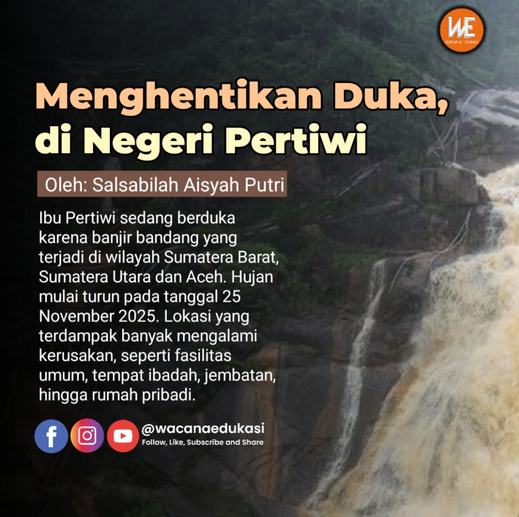 wacana-edukasi.com, OPINI–Ibu Pertiwi sedang berduka karena banjir bandang yang terjadi di wilayah Sumatera Barat, Sumatera Utara dan Aceh. Hujan mulai turun pada tanggal 25 November 2025. Lokasi yang terdampak banyak mengalami kerusakan, seperti fasilitas umum, tempat ibadah, jembatan, hingga rumah pribadi. Selain bangunan fisik, nyawa manusia pun banyak yang melayang. Menurut data BNPB (Badan Nasional Penanggulangan Bencana) ada 916 orang meninggal dunia, 274 orang hilang dan total keseluruhan terdampak mencapai 3,3 juta orang (04/12). Angka yang tidak sedikit. Kenapa bencana ini bisa terjadi?