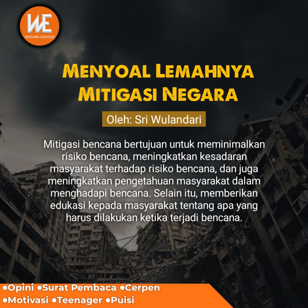 Oleh karena itu, adanya mitigasi sangat penting sebagai alat ukur untuk membaca awal terjadinya bencana. Mitigasi merupakan upaya untuk mengurangi risiko bencana. Program mitigasi dapat dilakukan melalui pembangunan fisik, penyadaran, dan peningkatan kemampuan menghadapi bencana yang terjadi.