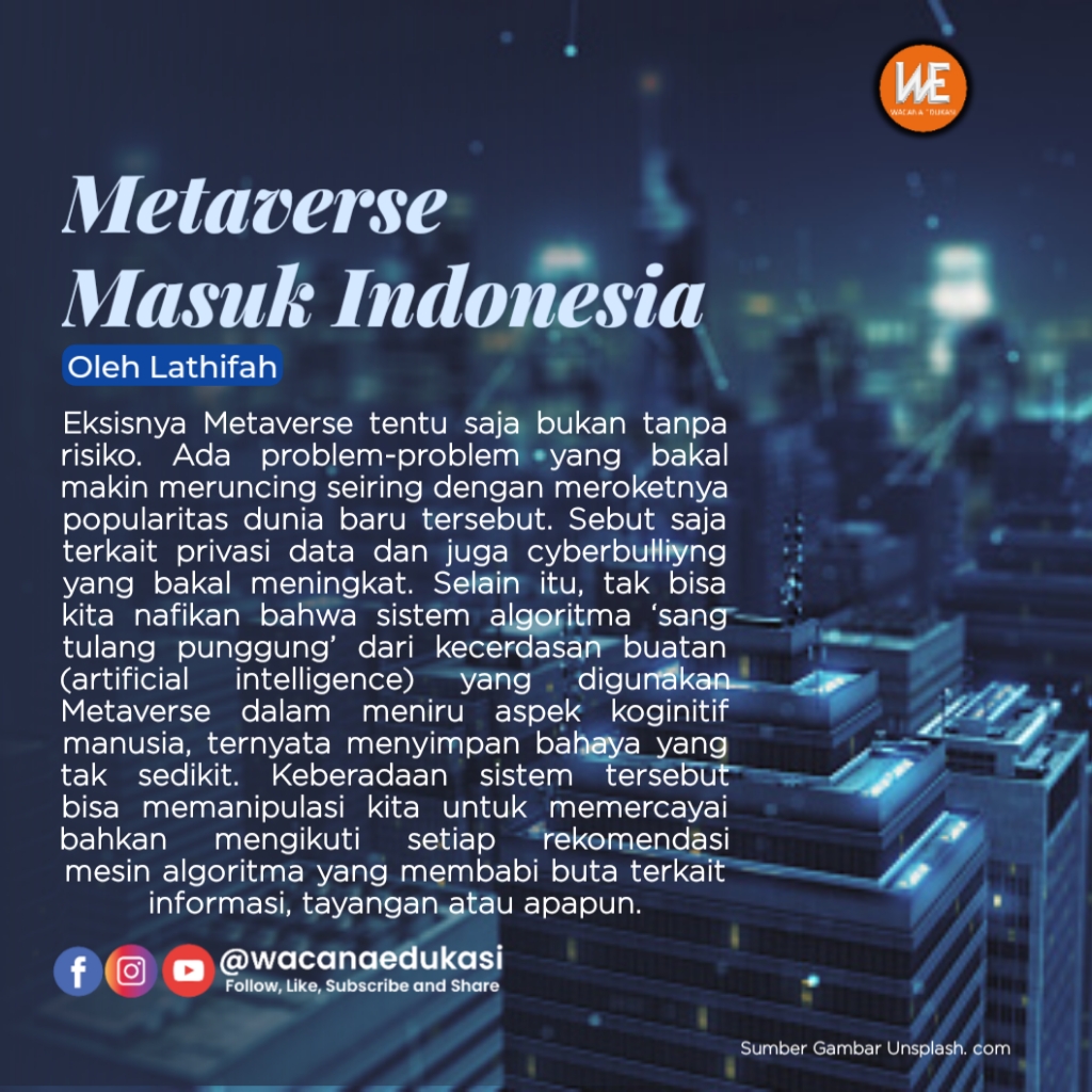 Namun, eksisnya Metaverse tentu saja bukan tanpa risiko. Ada problem-problem yang bakal makin meruncing seiring dengan meroketnya popularitas dunia baru tersebut. Sebut saja terkait privasi data dan juga cyberbulliyng yang bakal meningkat. Selain itu, tak bisa kita nafikan bahwa sistem algoritma ‘sang tulang punggung’ dari kecerdasan buatan (artificial intelligence) yang digunakan Metaverse dalam meniru aspek koginitif manusia, ternyata menyimpan bahaya yang tak sedikit. Keberadaan sistem tersebut bisa memanipulasi kita untuk memercayai bahkan mengikuti setiap rekomendasi mesin algoritma yang membabi buta terkait informasi, tayangan atau apa pun.