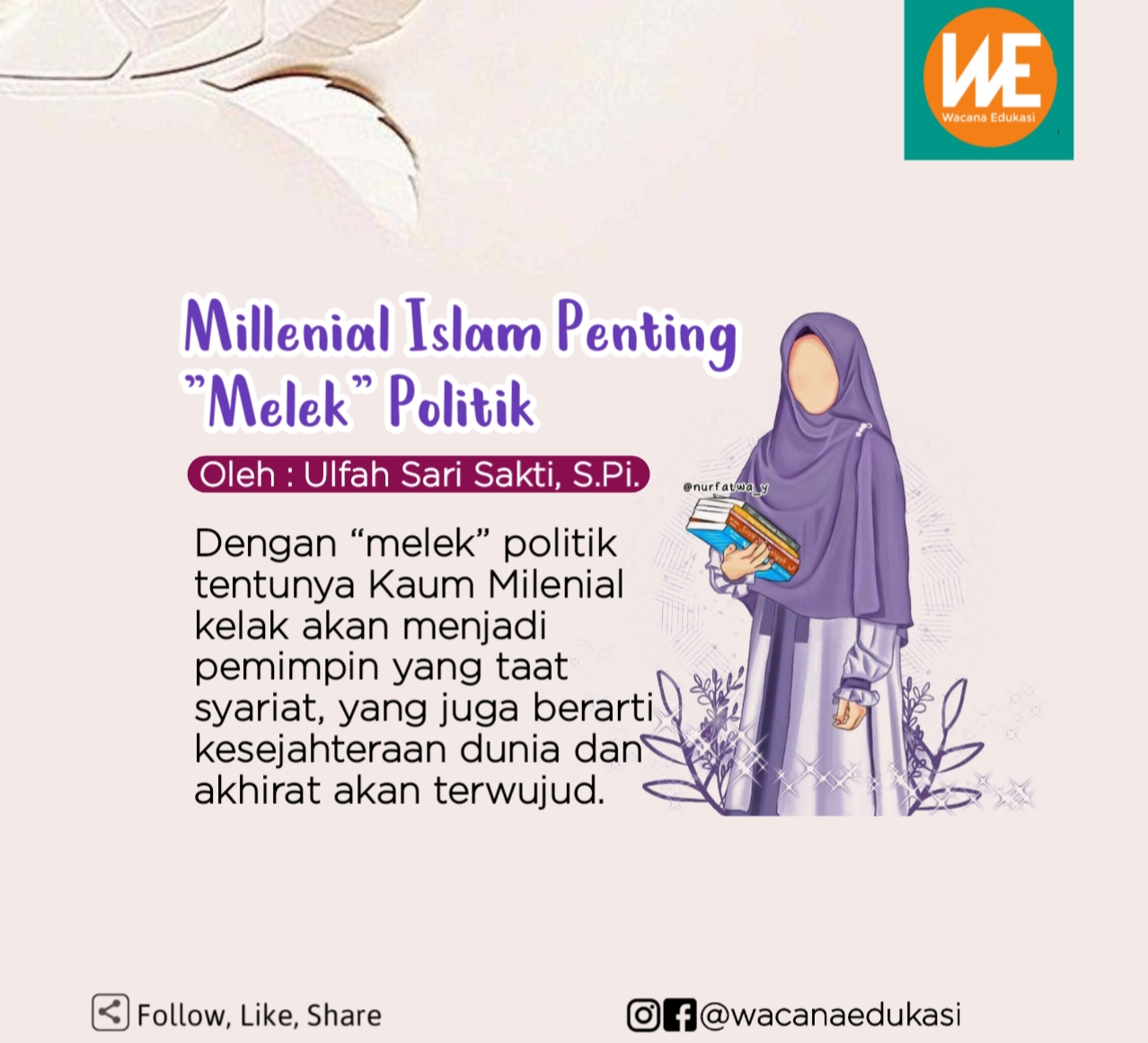 Berbeda dengan Sistem Kapitalis-Sekuler, politik (Siyasah) dalam sistem Islam merupakan aktivitas pemimpin dalam mengurusi urusan umat, sehingga sebagai generasi pelanjut pembangunan, sudah seharusnya Kaum Milenial “melek” politik. Dengan “melek” politik tentunya Kaum Milenial kelak akan menjadi pemimpin yang taat syariat, yang juga berarti kesejahteraan dunia dan akhirat akan terwujud.