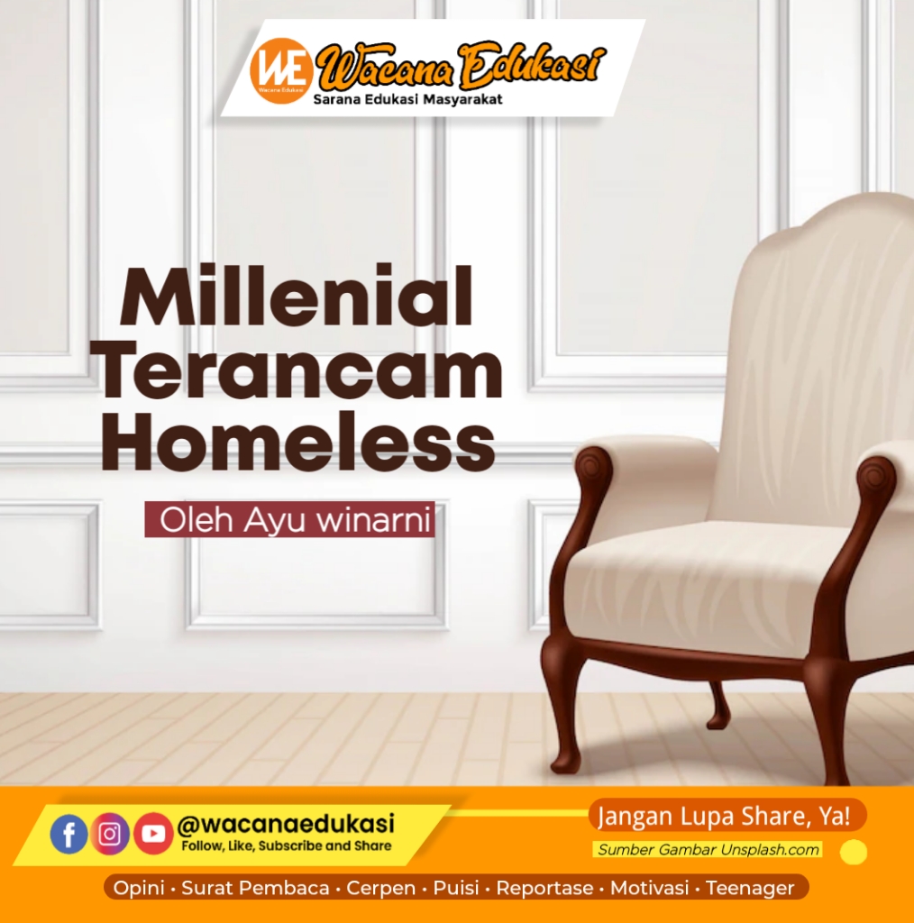 Generasi millenial dalam ancaman homeless apabila harga tanah kian melambung tinggi. Bukan tidak mungkin terjadi, faktanya hari ini bahwa untuk memiliki hunian harus merogok kocek sampai miliaran. Sementara yang terjadi generasi millenial kita masih menjadi pengangguran. Bukan karena males bekerja tapi memang lapangan kerja yang tak memadai dan sulit untuk diakses.