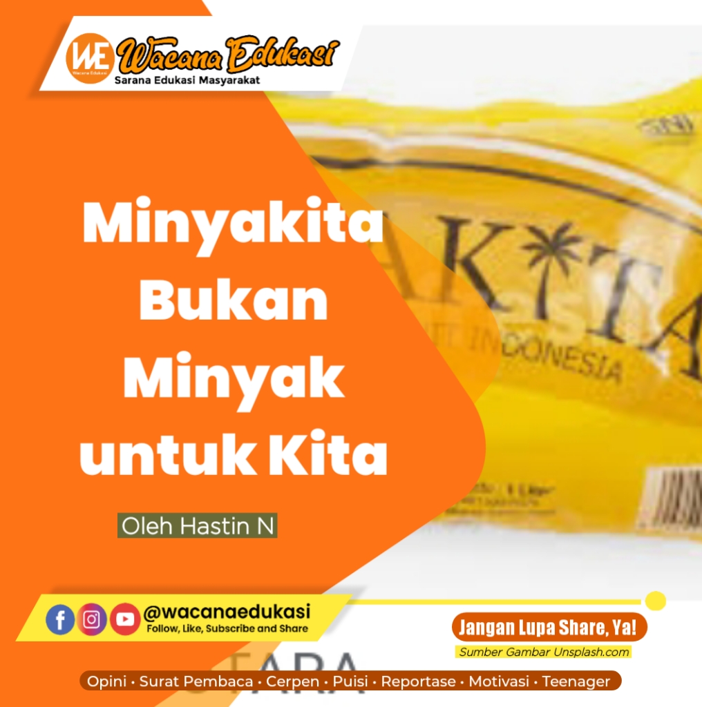 wacana-edukasi.com, SURAT PEMBACA– Minyakita yang diklaim sebagai solusi pemerintah menstabilkan harga demi mencukupi kebutuhan minyak goreng memicu permasalahan kompleks. Bermula dari kelangkaan minyak goreng di pasaran, kemudian pemerintah mengeluarkan kebijakan Permendag No. 6 Tahun 2022 tentang Penetapan Harga Eceran Tertinggi Minyak Goreng Sawit (jdih.kemendag.go.id, 01/2/2022). Pemerintah menetapkan satu harga jual minyak goreng di pasaran domestik Rp14.000/kg, dan menyediakan 20% dari total produksi untuk mencukupi kebutuhan dalam negeri. Sementara dari harga produksi Rp15.000/kg mengalami selisih harga yang dijanjikan akan dibayar oleh pemerintah. Namun, faktanya pemerintah mengalami gagal bayar selisih harga produksi dengan harga jual (afraksi) tersebut. Ketua Asosiasi Pengusaha Ritel Indonesia (Aprindo) Roy Mandey mengatakan belum ada titik terang terkait pembayaran utang pemerintah kepada peritel untuk pengadaan minyak goreng kemasan selama 2022 sebesar Rp 344 miliar (kompas.id, 23/4/2023). Ini menunjukkan pemerintah salah dalam mengambil kebijakan pada sektor komoditi minyak kelapa sawit dan produk turunannya.