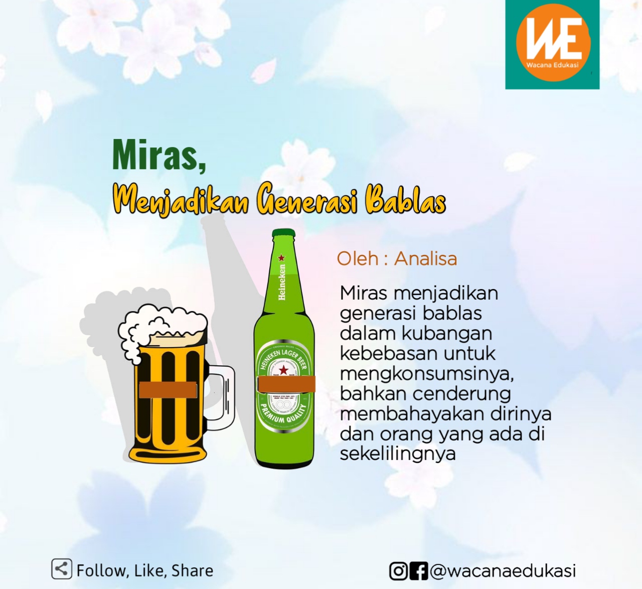 Miras menjadikan generasi bablas dalam kubangan kebebasan untuk mengkonsumsinya, bahkan cenderung membahayakan dirinya dan orang yang ada di sekelilingnya. Miras merupakan induk dari segala kejahatan apabila penggunanya telah sampai puncak memabukan, maka apapun yang ia lakukan dengan cara tidak sadar. Sehingga dengan bebas melakukan tindak kejahatan diluar nalar.