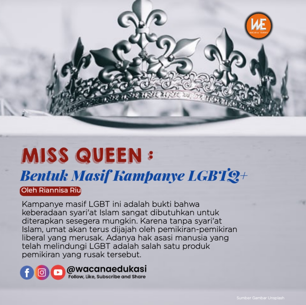 Namun sangat disayangkan, kisah nyata di masa lalu tersebut sepertinya hanya dianggap angin lalu bagi kalangan L6BTQ+ ini. Bahkan mereka mulai sering menggelar aksi terang-terangan seperti Kontes Miss Queen ini. Kontes ini tidak lain adalah bentuk kampanye besar-besaran dari kaum L6BTQ+ agar mereka mulai diterima di masyarakat dan tidak dikucilkan lagi.