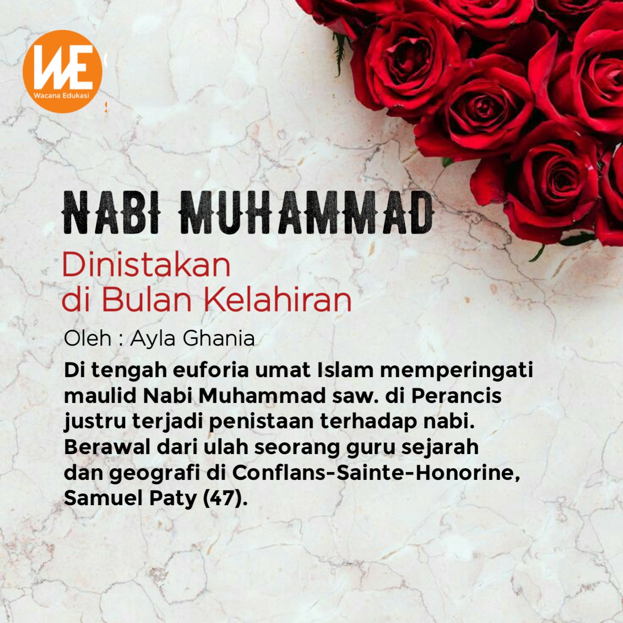 Wacana-edukasi.com — Di tengah euforia umat Islam memperingati maulid Nabi Muhammad saw. di Perancis justru terjadi penistaan terhadap nabi. Berawal dari ulah seorang guru sejarah dan geografi di Conflans-Sainte-Honorine, Samuel Paty (47). Pada awal Oktober, Paty mengajar tentang kebebasan berekspresi dengan menunjukkan karikatur Nabi Muhammad (Charlie Hebdo) kepada murid-muridnya. Hal ini memancing amarah muslim Perancis (www.kompas.com, 18/10/2020).