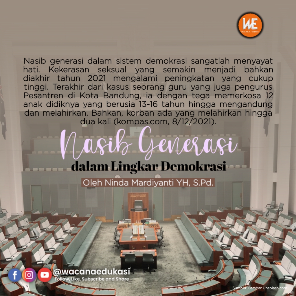 wacana-edukasi.com— Nasib generasi dalam sistem demokrasi sangatlah menyayat hati. Kekerasan seksual yang semakin menjadi bahkan diakhir tahun 2021 mengalami peningkatan yang cukup tinggi. Terakhir dari kasus seorang guru yang juga pengurus Pesantren di Kota Bandung, ia dengan tega memerkosa 12 anak didiknya yang berusia 13-16 tahun hingga mengandung dan melahirkan. Bahkan, korban ada yang melahirkan hingga dua kali (kompas.com, 8/12/2021).