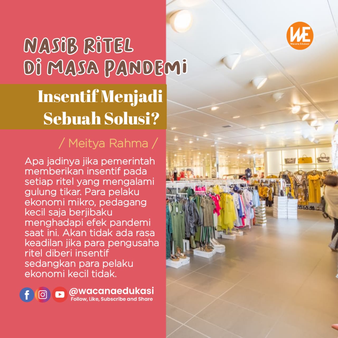 Pandemi memang luar biasa dampaknya. Terutama pada sektor ekonomi. Ritel-ritel pun mulai gulung tikar. Ini adalah tanda mulai berakhirnya bisnis besar para kapital. Tak dimungkiri memang ritel-ritel ini menyerap tenaga kerja yang tidak sedikit. Imbas penutupan ritel ini pun dirasakan para karyawan. Kemegahan pusat perbelanjaan semacam ritel ini pun kemudian tak sebanding dengan kondisinya saat ini, kolaps. Lalu para kapital berharap ada gelontotan insentif untuk ritel agar tidak terjadi pentupan ritel-ritel yang lain.