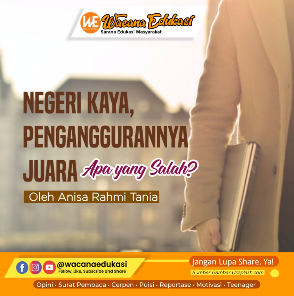 wacana-edukasi.com, OPINI-– Indonesia terkenal dengan negeri yang kaya akan sumber daya alam. Baik sumber daya alam yang tampak di permukaan maupun di kedalaman. Beragam tanaman, pohon, maupun beragam rempah tumbuh dengan baik karena kualitas tanah negeri ini yang subur. Begitu pula dengan kekayaan di kedalaman bumi, yakni barang tambang. Sebutlah batu bara, nikel, tembaga, emas, dan sebagainya menjadi rebutan pada investor. Namun dengan segala kekayaan alam tersebut Indonesia menjadi juara pengangguran se-ASEAN. Bukankah seharusnya kekayaan alam yang berlimpah tadi menjadikan rakyatnya mudah untuk mendapatkan mata pencaharian?