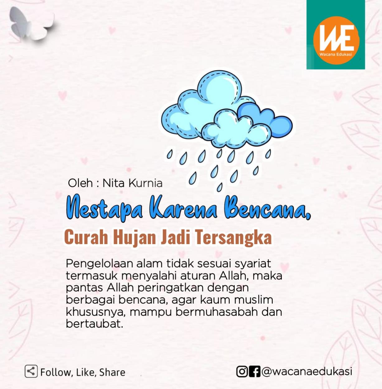 Curah hujan yang tinggi sering disebut menjadi penyebab berbagai bencana terjadi. Memang benar, memasuki musim penghujan berbagai bencana alam pun melanda negeri, tetapi curah hujan yang tinggi bukanlah sebab primer. Keseimbangan alam yang rusak menyebabkan struktur tanah menjadi rentan ketika musim penghujan tiba.