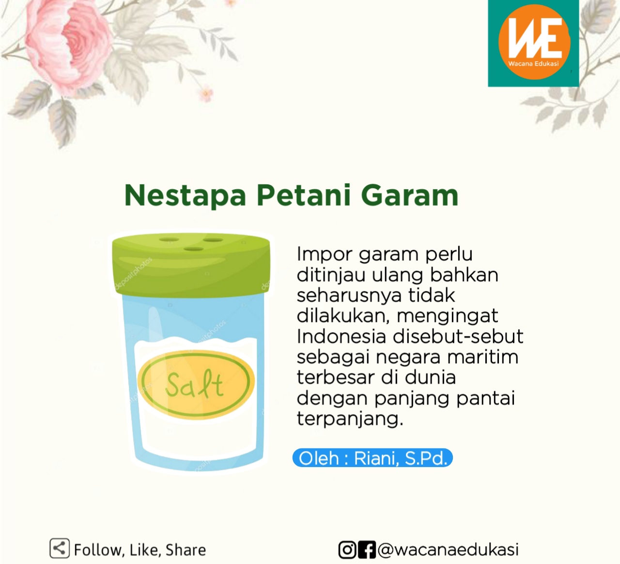 Dilansir dari Kompas.com. Petani garam yang tergabung dalam Himpunan Masyarakat Petambak Garam (HMPG) minta pemerintah untuk mengkaji ulang kebijakan impor garam yang tahun ini ditetapkan sebanyak 3,07 juta ton. Ketua Umum HMPG Mohammad Hasan di Surabaya, Kamis, mengatakan, kuota garam impor yang ditetapkan pemerintah tersebut lebih besar dibanding pada 2020 yang berjumlah 2,7 juta ton. “Sementara stok garam rakyat tahun lalu sebanyak 1,3 juta ton dan stok garam perusahaan pengolah garam yang diimpor tahun 2020 sampai sekarang masih menumpuk,” kata dia, dilansir dari Antara, Jum’at (26/3/2021).