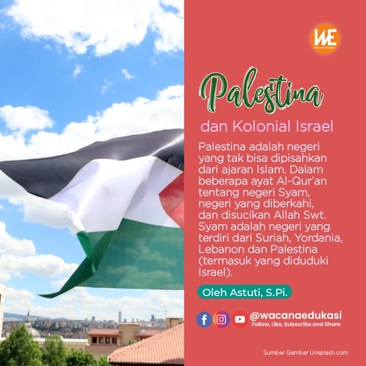 Palestina adalah negeri yang tak bisa dipisahkan dari ajaran Islam. Dalam beberapa ayat Al-Qur’an tentang negeri Syam, negeri yang diberkahi, dan disucikan Allah Swt. Syam adalah negeri yang terdiri dari Suriah, Yordania, Lebanon dan Palestina (termasuk yang diduduki Israel).
