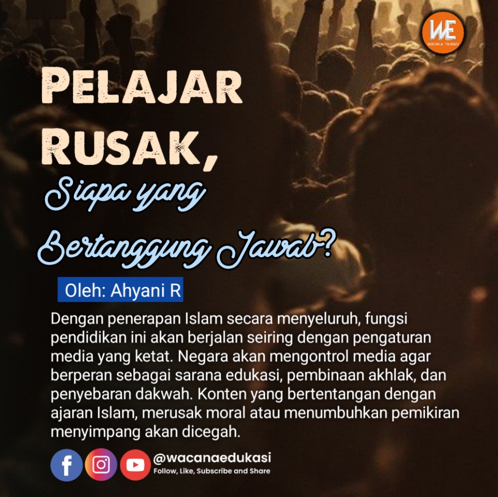 Dengan penerapan Islam secara menyeluruh, fungsi pendidikan ini akan berjalan seiring dengan pengaturan media yang ketat. Negara akan mengontrol media agar berperan sebagai sarana edukasi, pembinaan akhlak, dan penyebaran dakwah. Konten yang bertentangan dengan ajaran Islam, merusak moral atau menumbuhkan pemikiran menyimpang akan dicegah.