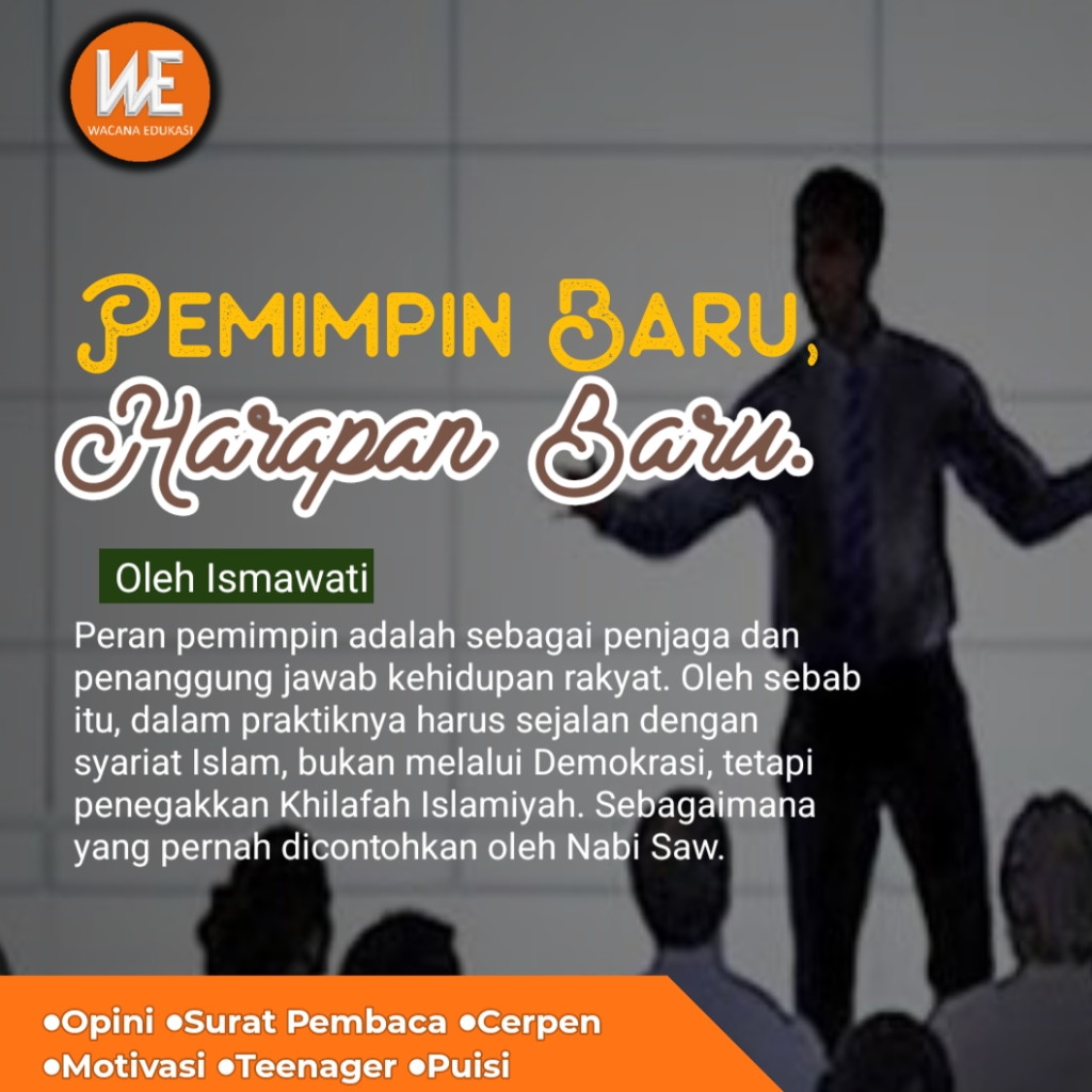 Dalam sistem hari ini, pergantian pemimpin dianggap sebagian orang sebagai harapan baru, menuju perubahan yang lebih baik. Demokrasi menganggap, keberhasilan kepemimpinan adalah terletak pada keberhasilan individu yang memimpin. Padahal, jika kita melihat lebih mendalam, kerusakan ini bersumber pada rusaknya sistem.yang diterapkan, yakni kapitalisme dan Demokrasi. Dimana kita tahu bahwa, Demokrasi adalah sistem buatan manusia yang rusak dan merusak.