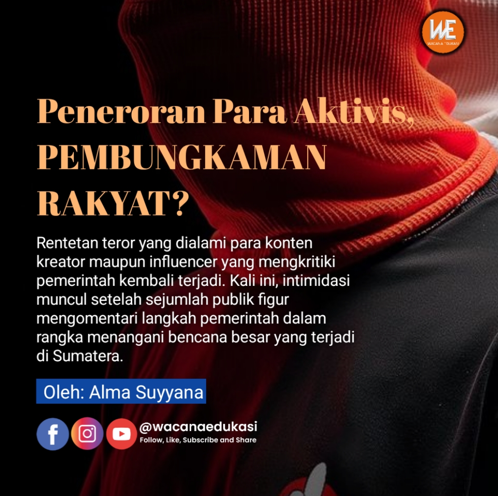 Wacana-edukasi.com, SURAT PEMBACA–Rentetan teror yang dialami para konten kreator maupun influencer yang mengkritiki pemerintah kembali terjadi. Kali ini, intimidasi muncul setelah sejumlah publik figur mengomentari langkah pemerintah dalam rangka menangani bencana besar yang terjadi di Sumatra. Salah satunya dialami oleh influencer Ramond Dony Adam yang kerap dipanggil DJ Donny, dia mendapat kiriman bangkai ayam dengan kepala terputus, yang disertai beberapa lembar kertas yang berisikan tulisan ancaman. Tak lama setelah itu, ia dikirimi bom molotov. “Bukannya berbahaya bagi dirinya, melainkan bagi banyak orang” ujarnya kala dua orang tak kenal melempar bom molotov ke rumah. Kejadian tersebut memicu kekhawatiran publik atas kebebasan berekspresi di Indonesia.