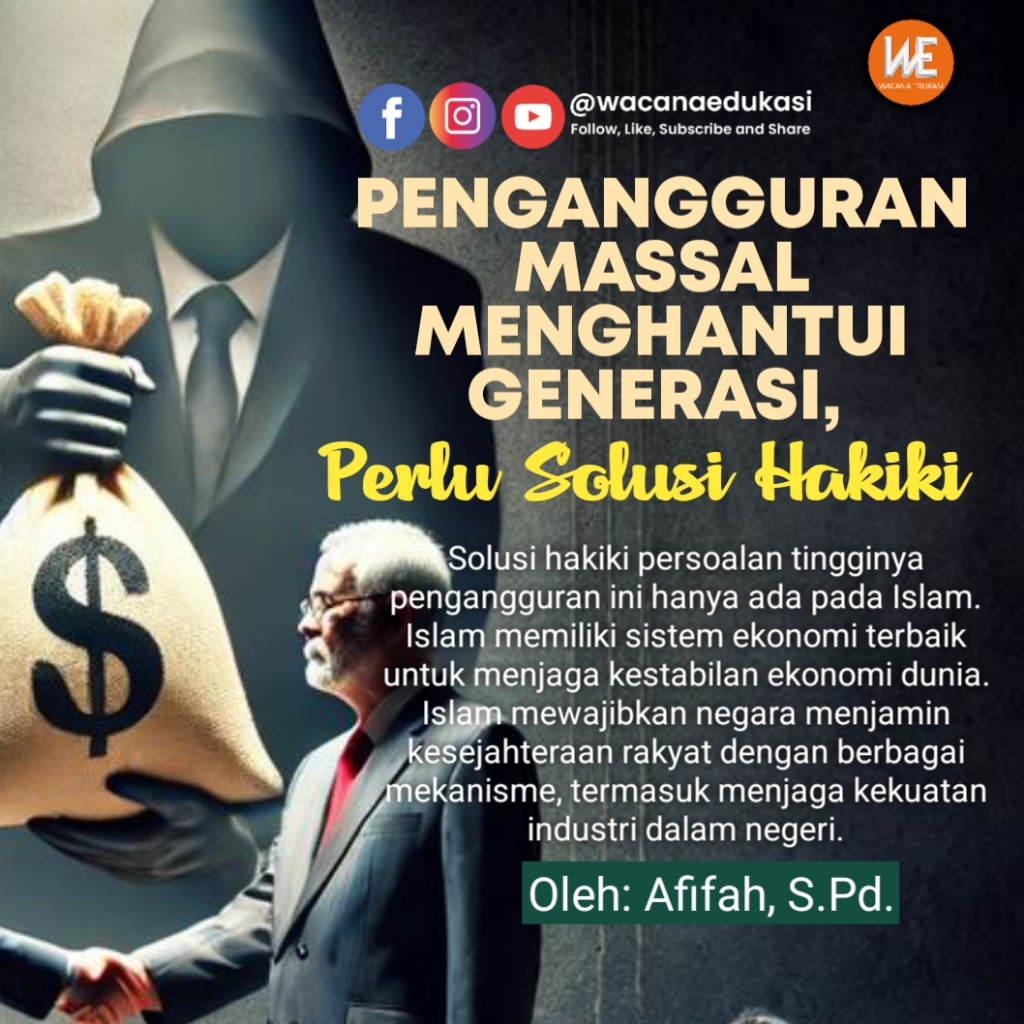 Solusi hakiki persoalan tingginya pengangguran ini hanya ada pada Islam. Islam memiliki sistem ekonomi terbaik untuk menjaga kestabilan ekonomi dunia. Islam mewajibkan negara menjamin kesejahteraan rakyat dengan berbagai mekanisme, termasuk menjaga kekuatan industri dalam negeri.