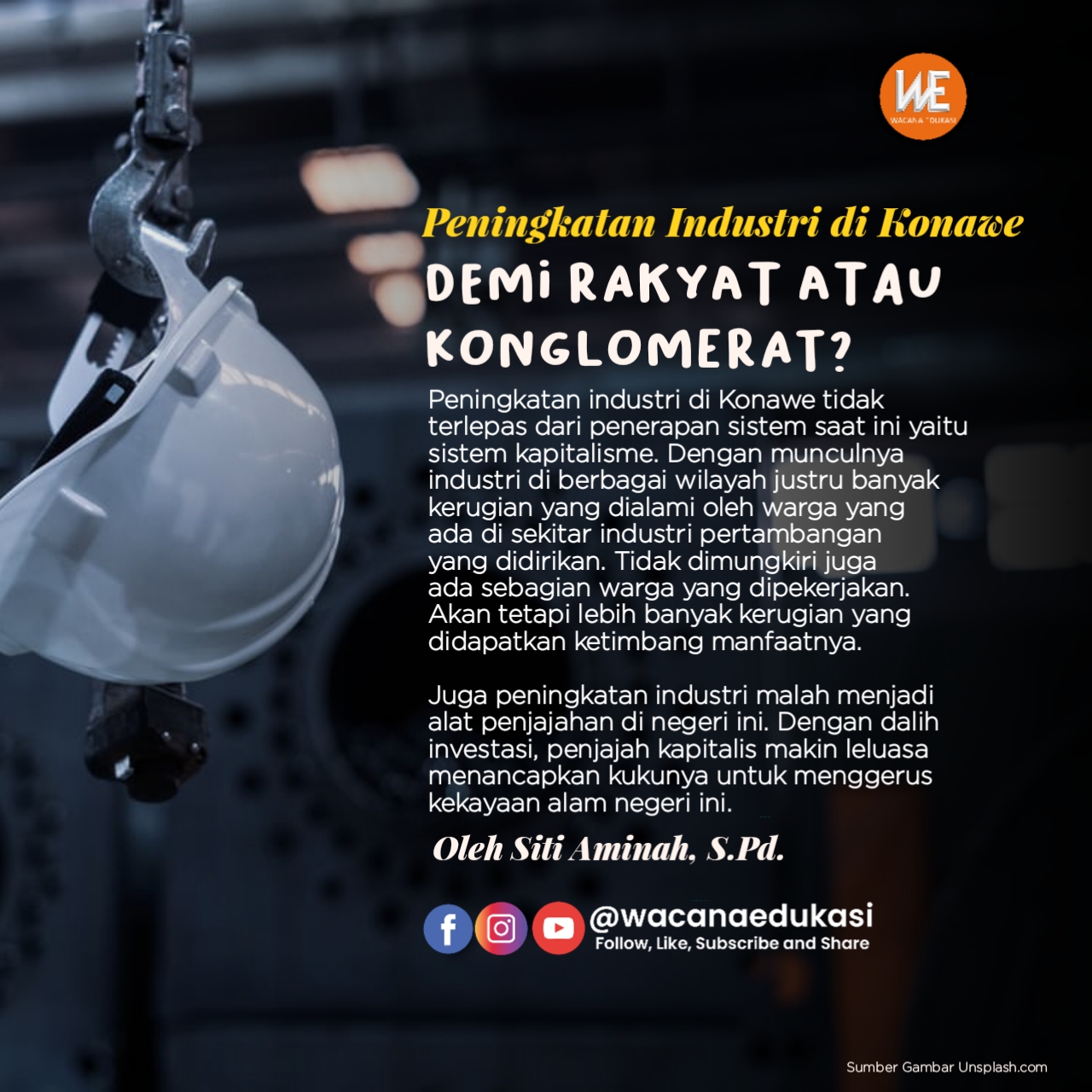 Peningkatan industri di Konawe tidak terlepas dari penerapan sistem saat ini yaitu sistem kapitalis. Dengan munculnya industri diberbagai wilayah justru banyak kerugian yang dialami oleh warga yang ada disekitar industri pertambangan yang didirikan. Tidak dipungkiri juga ada sebagian warga yang dipekerjakan. Akan tetapi lebih banyak kerugian yang didapatkan ketimbang manfaanya.