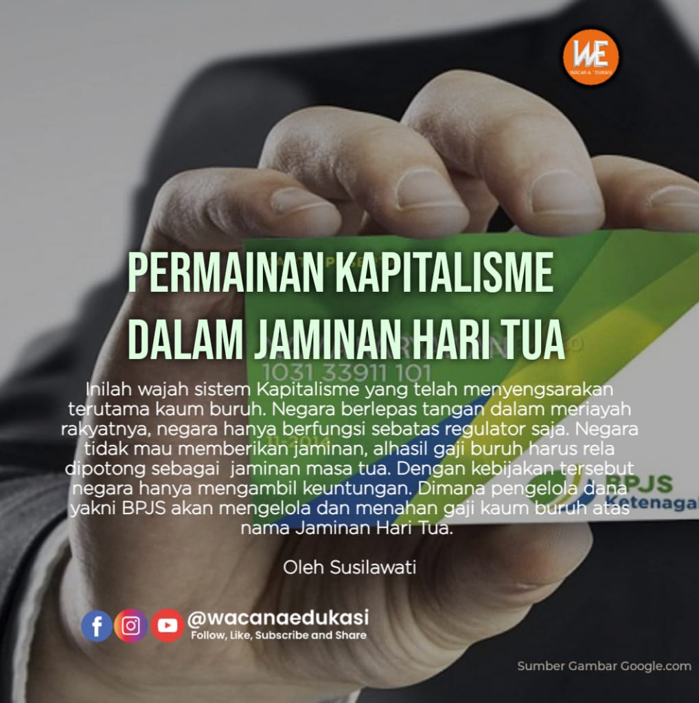 Inilah wajah sistem kapitalisme yang telah menyengsarakan terutama kaum buruh. Negara berlepas tangan dalam meriayah rakyatnya, negara hanya berfungsi sebatas regulator saja. Negara tidak mau memberikan jaminan, alhasil gaji buruh harus rela dipotong sebagai jaminan masa tua. Dengan kebijakan tersebut negara hanya mengambil keuntungan. Dimana pengelola dana yakni BPJS akan mengelola dan menahan gaji kaum buruh atas nama Jaminan Hari Tua. Sungguh kapitalisme telah membuat rakyat sangat menderita. Dengan gaji yang tak seberapa masih saja dirundung masalah baru yang akan menambah beban rakyat. Di tengah banyaknya PHK akibat pandemi yang belum kunjung selesai.