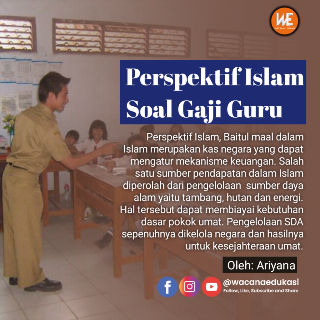 Persepktif Islam, Baitul maal dalam Islam merupakan kas negara yang dapat mengatur mekanisme keuangan. Salah satu sumber pendapatan dalam Islam diperolah dari pengelolaan sumber daya alam yaitu tambang, hutan dan energi. Hal tersebut dapat membiayai kebutuhan dasar pokok umat. Pengelolaan SDA sepenuhnya dikelola negara dan hasilnya untuk kesejahteraan umat. Begitupun gaji guru dapat diambil dari pos kepemilikan negara. Negara mengelola pendapatan untuk kepentiang rakyat termasuk dalam bidang pendidikan. Guru tonggak pendidikan, untuk itu kemuliaan seorang pendidik harus terus diperjuangkan karena mereka adalah pilar peradaban.