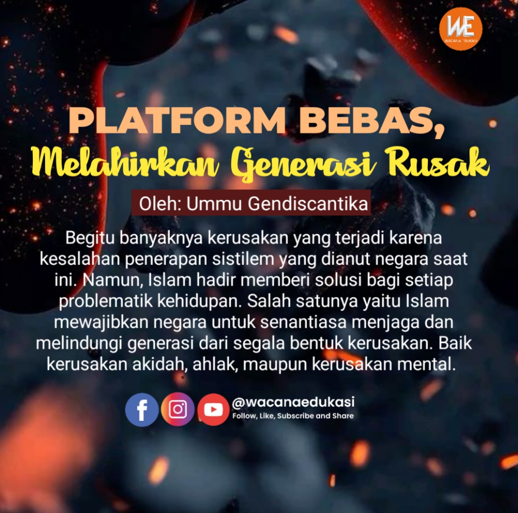 Itulah bahayanya jika platform digital dibuat bebas seperti saat ini. Platform digital seharusnya bisa dimanfaatkan untuk kemajuan pemikiran anak muda. Di antaranya menjadikan manusia yang semakin terdidik dan berakhlak baik. Akan tetapi, karena kesalahan pembuatan platform itu justru menjadikan para pemuda semakin terjerumus pada jurang kerusakan.