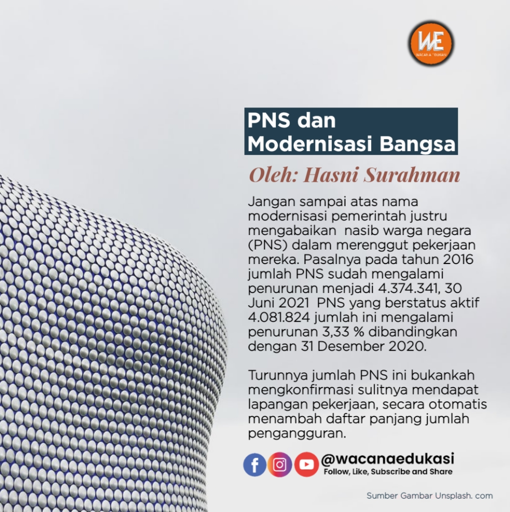 Namun jangan sampai atas nama modernisasi pemerintah justru mengabaikan nasib warga negara (PNS) dalam merenggut pekerjaan mereka. Pasalnya pada tahun 2016 jumlah PNS sudah mengalami penurunan menjadi 4.374.341, 30 Juni 2021 PNS yang berstatus aktif 4.081.824 jumlah ini mengalami penurunan 3,33 % dibandingkan dengan 31 Desember 2020.