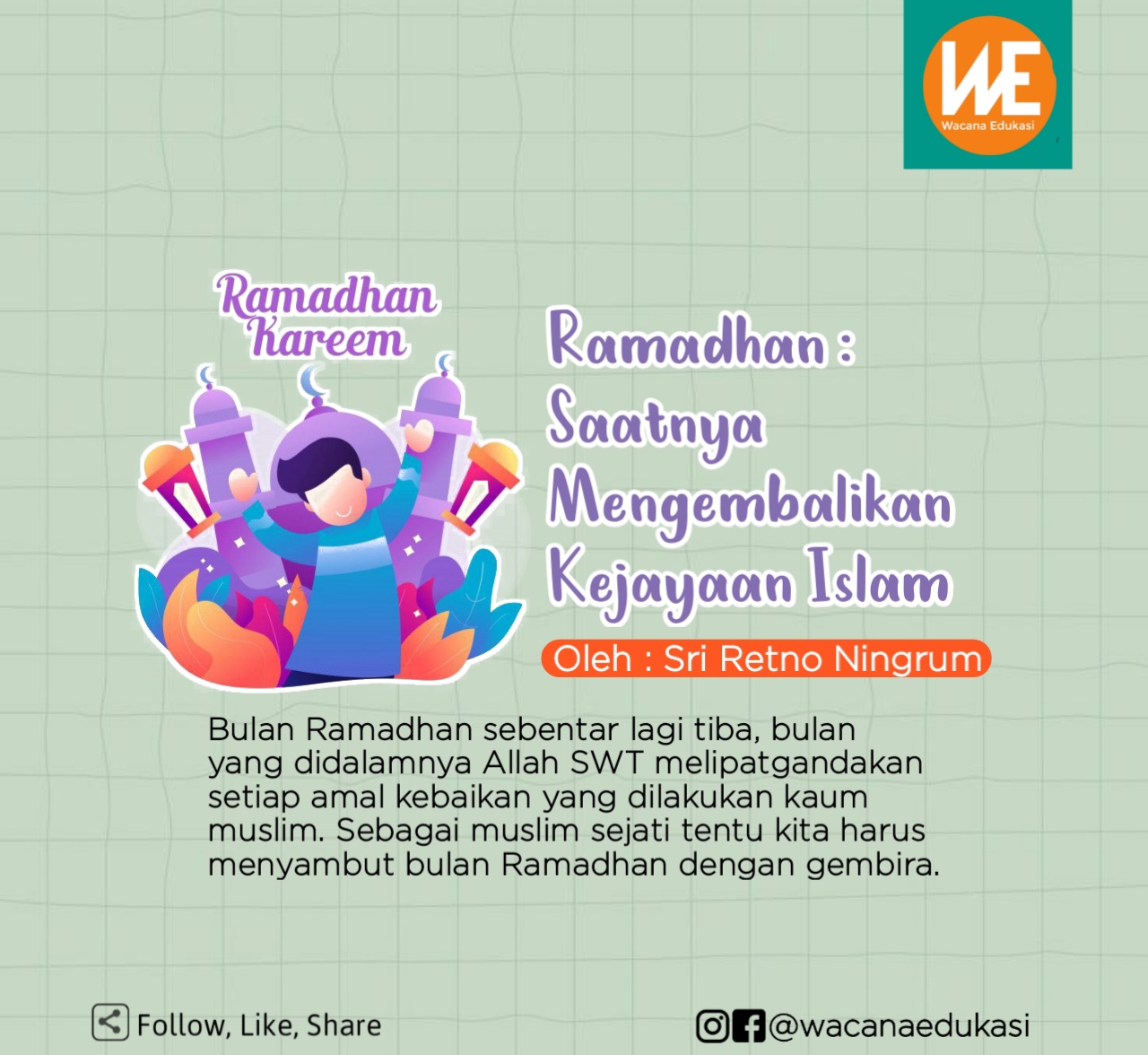 Wacana-edukasi.com_ Bulan Ramadhan sebentar lagi tiba, bulan yang didalamnya Allah SWT melipatgandakan setiap amal kebaikan yang dilakukan kaum muslim. Sebagai muslim sejati tentu kita harus menyambut bulan Ramadhan dengan gembira. Allah SWT berfirman dalam surah Yunus ayat 58: