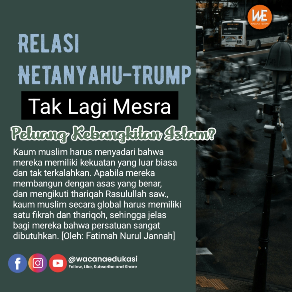 Wacana-edukasi.com, SURAT PEMBACA-– Nampaknya kondisi perpolitikan global sedang memanas dan gonjang-ganjing. Hubungan mesra Trump-Netanyahu berakhir putus juga. Ini menyadarkan kita bahwa dewasa kini tak ada yang namanya teman sejati ataupun kekasih abadi. Sebab, yang abadi bagi mereka adalah kepentingan masing-masing.