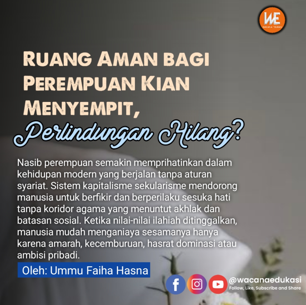 Nasib perempuan semakin memprihatinkan dalam kehidupan modern yang berjalan tanpa aturan syariat. Sistem kapitalisme sekularisme mendorong manusia untuk berfikir dan berperilaku sesuka hati tanpa koridor agama yang menuntut akhlak dan batasan sosial. Ketika nilai-nilai ilahiah ditinggalkan, manusia mudah menganiaya sesamanya hanya karena amarah, kecemburuan, hasrat dominasi atau ambisi pribadi.