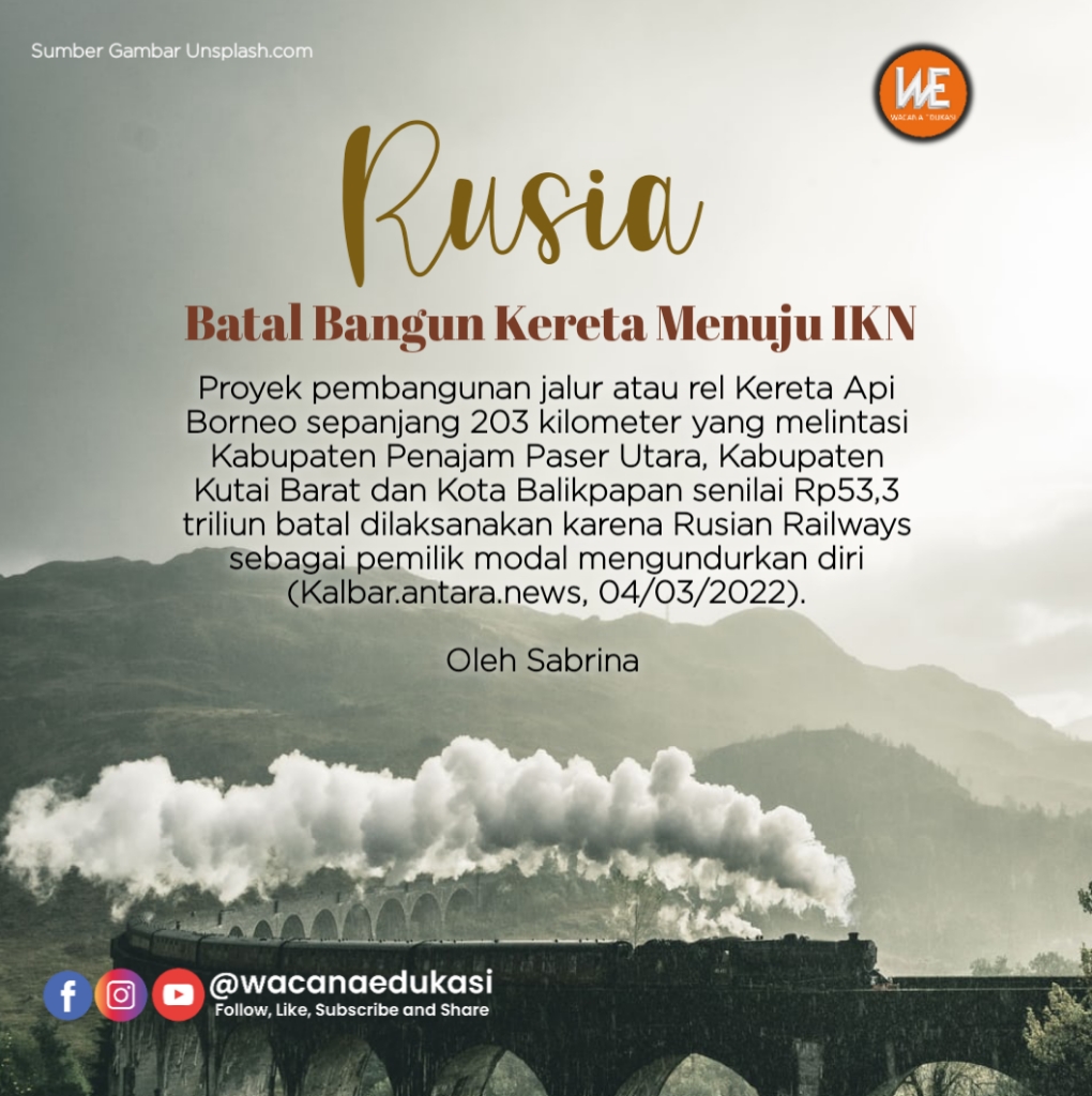 wacana-edukasi.com– Proyek pembangunan jalur atau rel Kereta Api Borneo sepanjang 203 kilometer yang melintasi Kabupaten Penajam Paser Utara, Kabupaten Kutai Barat dan Kota Balikpapan senilai Rp53,3 triliun batal dilaksanakan karena Rusian Railways sebagai pemilik modal mengundurkan diri (Kalbar.antara.news, 04/03/2022).