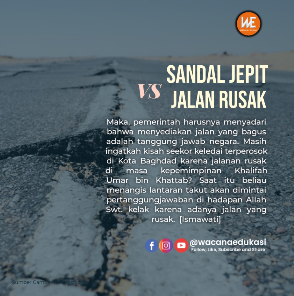 Maka, pemerintah harusnya menyadari bahwa menyediakan jalan yang bagus adalah tanggung jawab negara. Masih ingatkah kisah seekor keledai terperosok di Kota Baghdad karena jalanan rusak di masa kepemimpinan Khalifah Umar bin Khattab? Saat itu beliau menangis lantaran takut akan dimintai pertanggungjawaban di hadapan Allah Swt. kelak karena adanya jalan yang rusak.