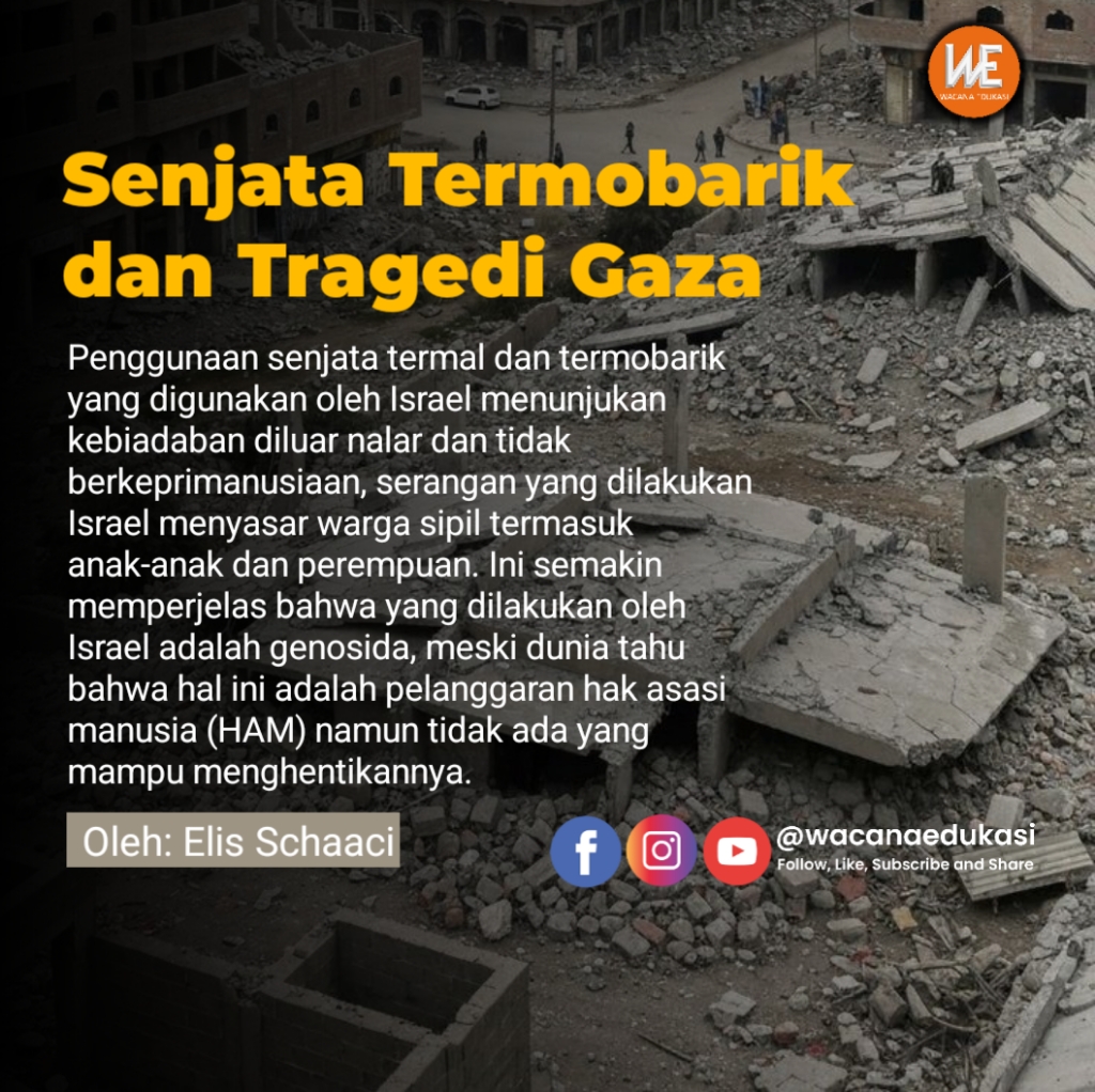 Wacana-edukasi.com, SURAT PEMBACA--Israel kembali melancarkan serangan ke Palestina, dan serangannya kali ini diyakini menggunakan senjata termal dan termobarik untuk membunuh ribuan warga Palestina yang ada dijalur Gaza. Senjata ini adalah jenis amunisi yang mengandalkan panas ekstrem dan tekanan udara untuk menghancurkan target. Terbukti dalam laporan investigasi yang dilakukan oleh Al Jazeera yang berjudul “The Rest of the Story” setidaknya 2.842 korban hilang di Palestina sejak agresi dimulai pada Oktober 2023 (Cnnindonesia.com (14/02/2026).