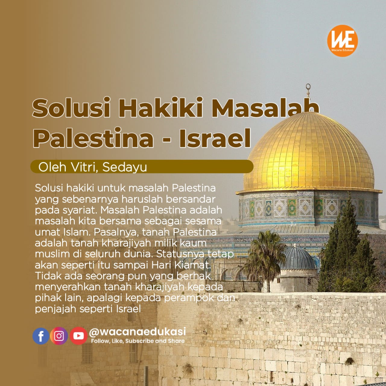 Solusi hakiki untuk masalah Palestina yang sebenarnya haruslah bersandar pada syariat. Masalah Palestina adalah masalah kita bersama sebagai sesama umat Islam. Pasalnya, tanah Palestina adalah tanah kharajiyah milik kaum muslim di seluruh dunia. Statusnya tetap akan seperti itu sampai Hari Kiamat. Tidak ada seorang pun yang berhak menyerahkan tanah kharajiyah kepada pihak lain, apalagi kepada perampok dan penjajah seperti Israel. Sikap semestinya haruslah seperti yang ditunjukkan oleh Sultan Abdul Hamid II yang menolak sama sekali segala bentuk penyerahan tanah Palestina kepada kaum kafir meskipun hanya sejengkal.