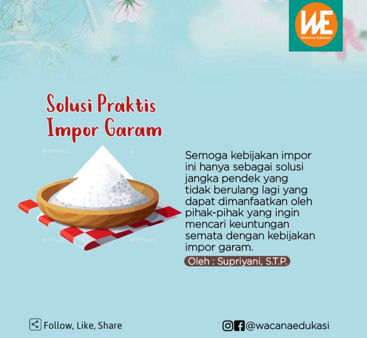 Dilansir dari CNN Indonesia.com, rencana pemerintah yang akan melakukan impor garam untuk menutupi kebutuhan industri pada tahun ini menjadi perhatian masyarakat. Disebabkan Indonesia memiliki julukan negara maritim. Akan tetapi, belum mampu untuk memenuhi kebutuhan garam di dalam negeri khususnya kebutuhan industri. Sehingga, Menteri Kelautan dan Perikanan Sakti Wahyu Trenggono menyebut pemerintah telah memutuskan akan melakukan impor garam sebanyak 3 juta ton (18/3/21).