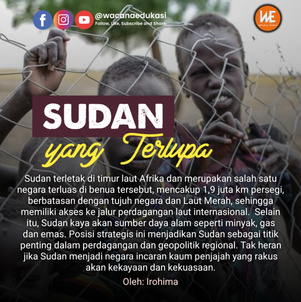 Sudan terletak di timur laut Afrika dan merupakan salah satu negara terluas di benua tersebut, mencakup 1,9 juta km persegi, berbatasan dengan tujuh negara dan Laut Merah, sehingga memiliki akses ke jalur perdagangan laut internasional, selain itu Sudan kaya akan sumber daya alam seperti minyak, gas dan emas. Posisi strategis ini menjadikan Sudan sebagai titik penting dalam perdagangan dan geopolitik regional. Tak heran jika Sudan menjadi negara incaran kaum penjajah yang rakus akan kekayaan dan kekuasaan.