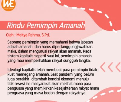 Oleh: Meitya Rahma, S.Pd. (Pegiat Literasi)Wacana-edukasi.com -- Seorang pemimpin yang memahami bahwa jabatan adalah amanah dan harus dipertanggun